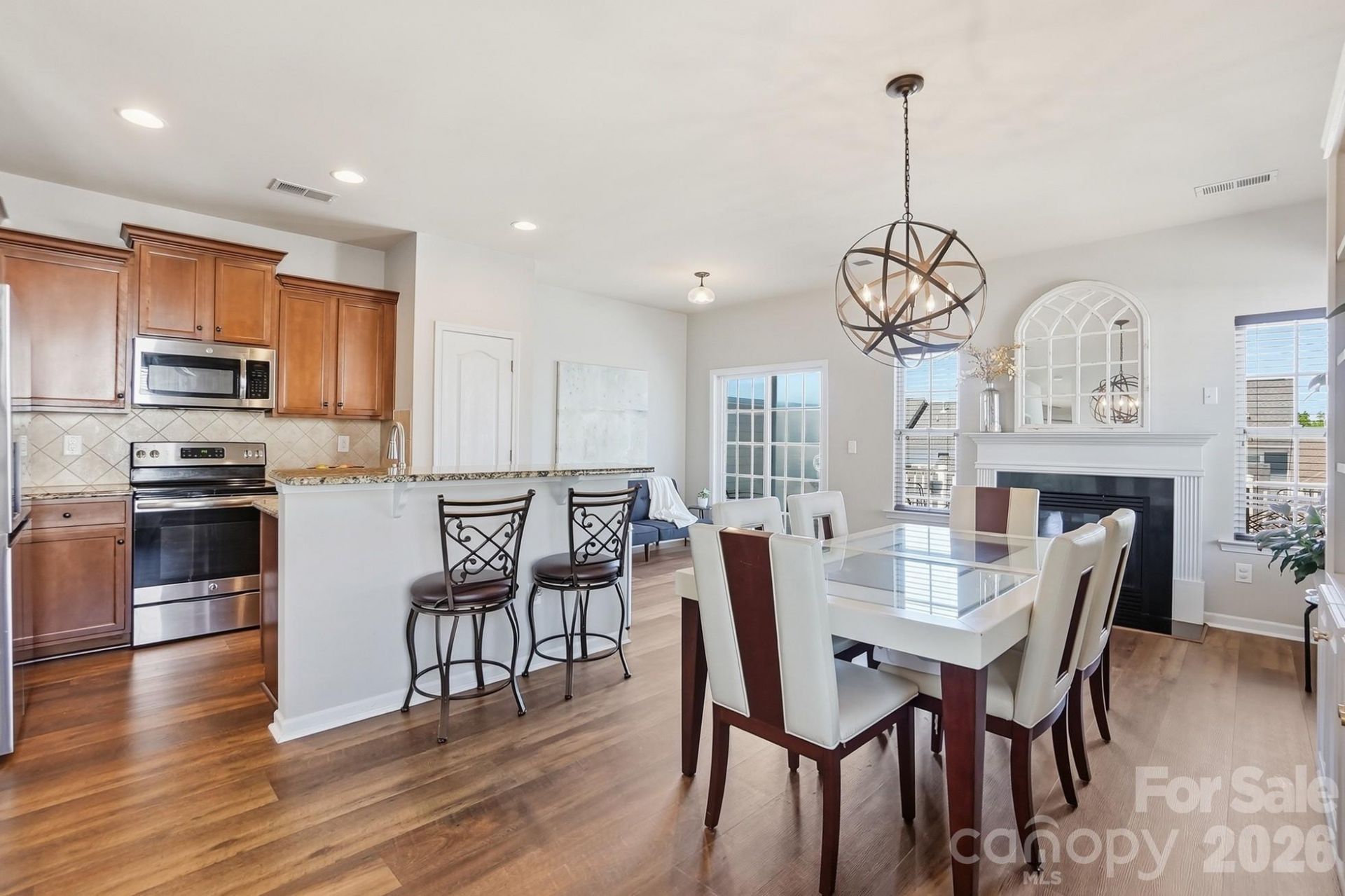 Light-filled end-unit townhome in a prime Mint Hill location, offering an exceptional combination of privacy, space, and convenience. With windows lining the side of the home, the interior feels open and inviting?an uncommon feature in townhome living.The main level features durable flooring, a cozy fireplace, and a well-designed layout that flows seamlessly between living, dining, and kitchen spaces?ideal for both everyday living and entertaining.The kitchen offers granite countertops, ample cabinetry, and stainless steel appliances, while the dining area is enhanced by custom built-ins that add both character and functional storage.The 3 bedrooms upstairs provide comfortable retreats with thoughtful layouts. One of this home's standout features is the unmatched convenience of having grocery stores, restaurants, and neighborhood parks just steps away.There's also a spacious 2-car garage and extra long driveway. With easy access to I-485, commuting is simple. A rare opportunity to enjoy low-maintenance living in one of Mint Hill's most convenient locations.